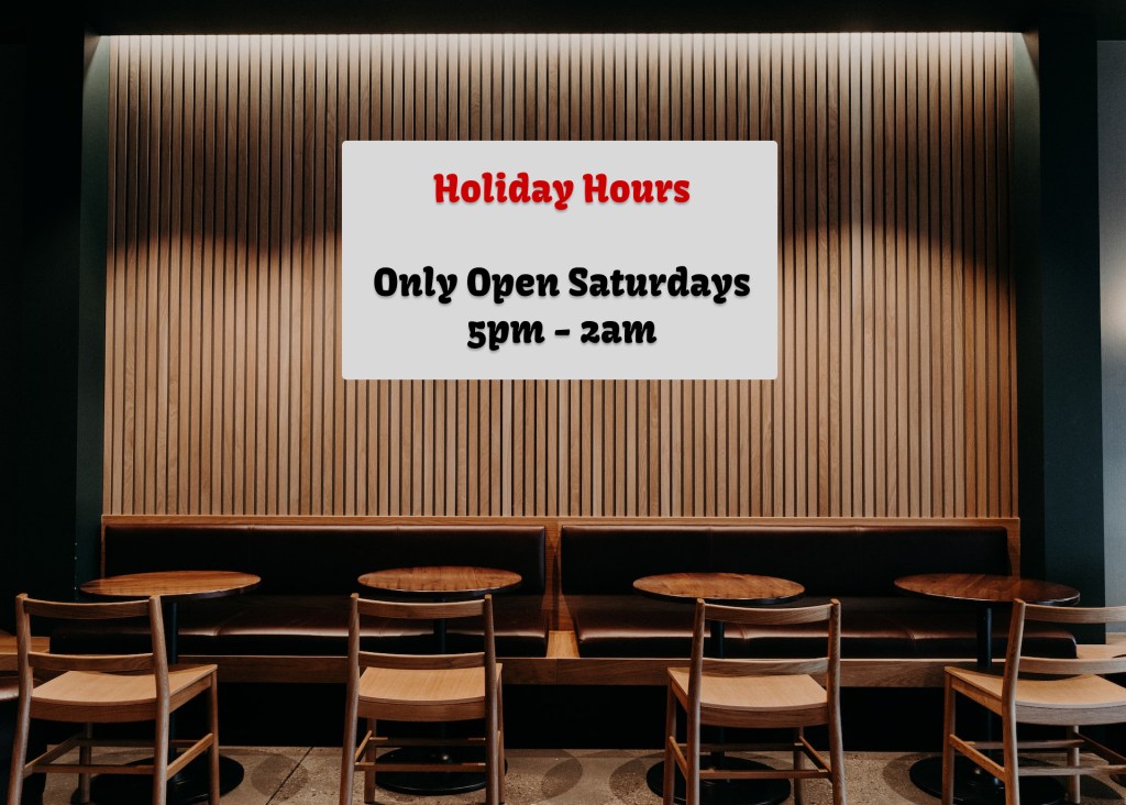 December 9, 2023 by nirvanaroadhouse Holiday Hours Starting 12/9, we will only be open on Saturdays from 5pm – 2am Share this: Share on X (Opens in new window) X Share on Facebook (Opens in new window) Facebook Like Loading... Related